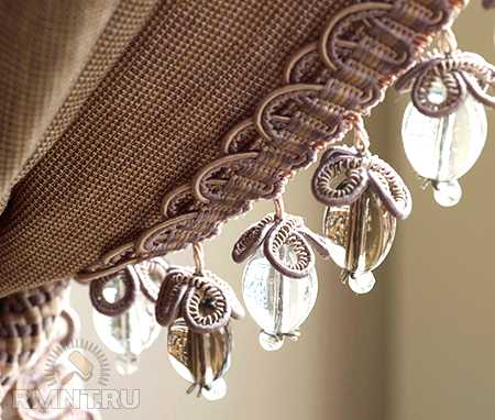 Помимо обычной бахромы и кисточек из нитей, край шторы вполне можно украсить всевозможными бусинами, декоративными монетками, а также бисером. Да, нашить все это на край занавеси будет не так уж легко и займет достаточно много времени, но выглядеть такое украшение будет особенно жизнерадостно и ярко.