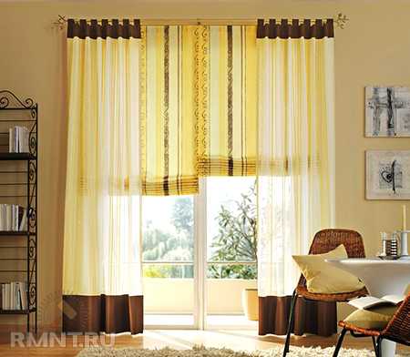 Если гардина или портьера однотонные и выглядят скучно, можно не менять занавеси целиком, а «разбавить» однотонный ансамбль полоской ткани с ярким орнаментом или крупным рисунком. Например, если окно декорировано бежевыми портьерами, можно подобрать полоску ткани в коричневую клетку, прострочить и пришить к верхней части или пустить по нижнему краю (можно сочетать оба варианта).