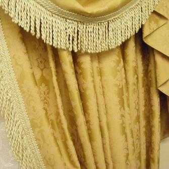 Классический вариант бахромы, проходящей по всей боковой части тяжелой шторы. Небольшие кисточки подобраны в тон ткани