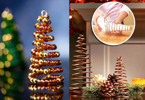 Начнем с главного — с елки. Миниатюрное деревце, сделанное из подручных материалов, само может стать полноценным украшением. Его можно вырезать из бумаги по мотивам вытынанок или склеить из трех декоративных кружевных салфеток, свернутых в виде конуса с широким основанием, а внутрь поместить светодиодную подсветку на батарейке. Стильно и необычно смотрятся «елки» из закрученной в спираль толстой проволоки с добавлением крупных перламутровых бусин.