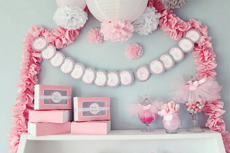 Из этой же бумаги изготавливаются гирлянды и крупные цветы. На гирлянде из бумажных флажков прекрасно будет смотреться аппликация с именем новорожденного.