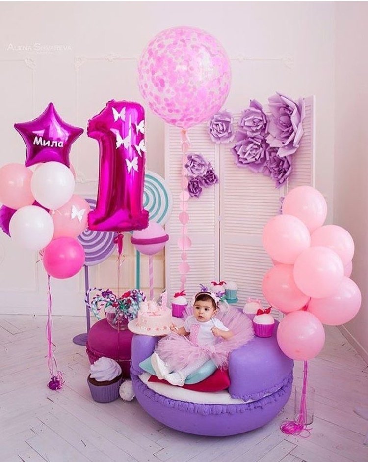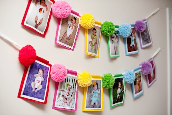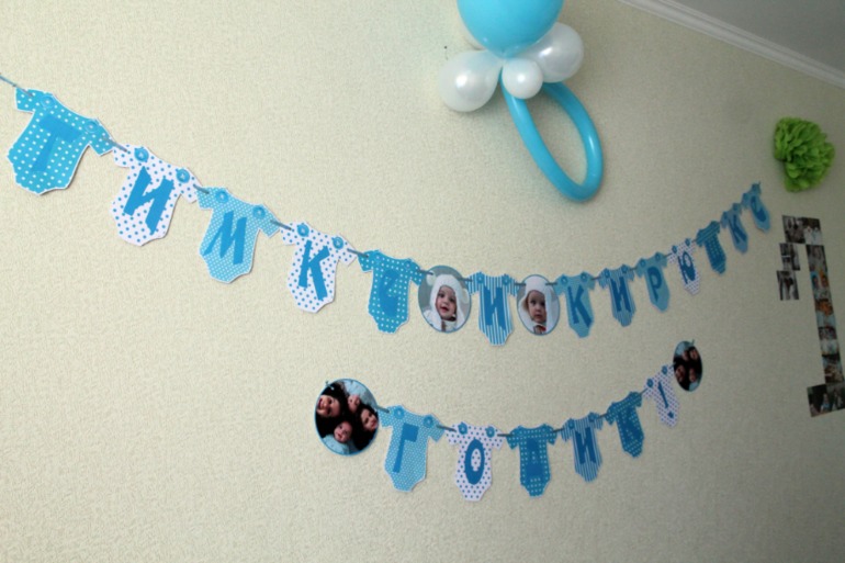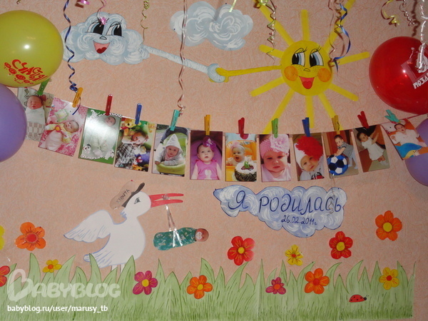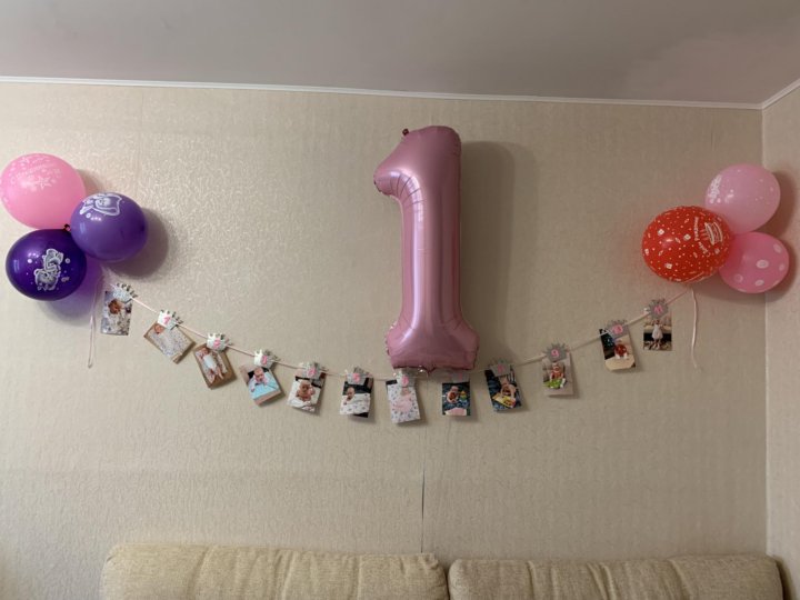 Прекрасно будет смотреться небольшая цифра 1 на стене, выполненная из маленьких воздушных шариков. Заранее следует подумать и о распечатке первых фотографий малыша. Ними можно украсить стены, шторы и мебель.