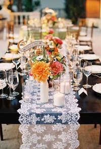 Как не потерять то самое настроение “лучшего дня в жизни”? Во-первых, цветов много не бывает. Сейчас дизайнеры все чаще обращаются к технике выкладывания цветов и вьющихся лиственных растений прямо на столах. Дополнительная романтика добавляется свечами, более элегантной посудой и фонариками, которые можно эффектно разместить над столами. Не стоит забывать и о мебели. Столы могут быть круглыми, деревянные стулья можно выбрать с интересной резьбой, а уютные вышитые и ажурные скатерти наверняка с легкостью впишутся в свадебную атмосферу.