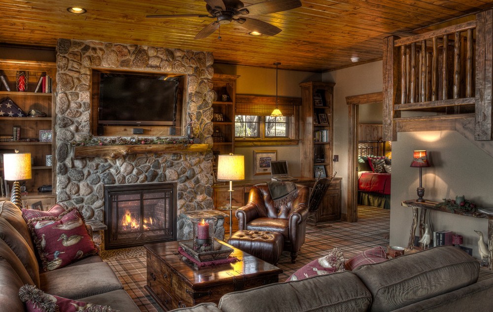 Для отделки стен гостиной деревенского дома можно использовать блок-хаус или имитацию бруса.