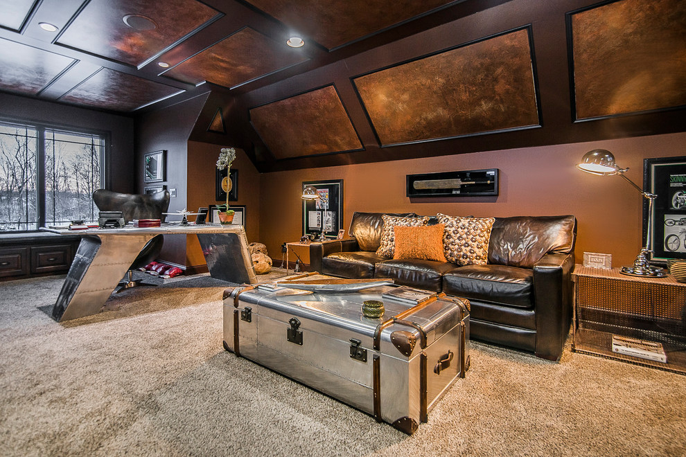Дополнительно его можно украсить картинами и постерами на автомобильную тематику, поставить кожаный диван.