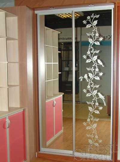Пескоструйный рисунок относится к направлению витражного искусства, которое развито уже достаточно давно. Суть этого метода состоит в нанесении рисунка на стеклянную плоскость дверей шкафов-купе с помощью струи воздуха с песком. Песок, царапая стекло, позволяет рисовать на его поверхности очень красивые рисунки, которые имеют великолепное свойство видоизменяться в зависимости от степени и направленности освещения.