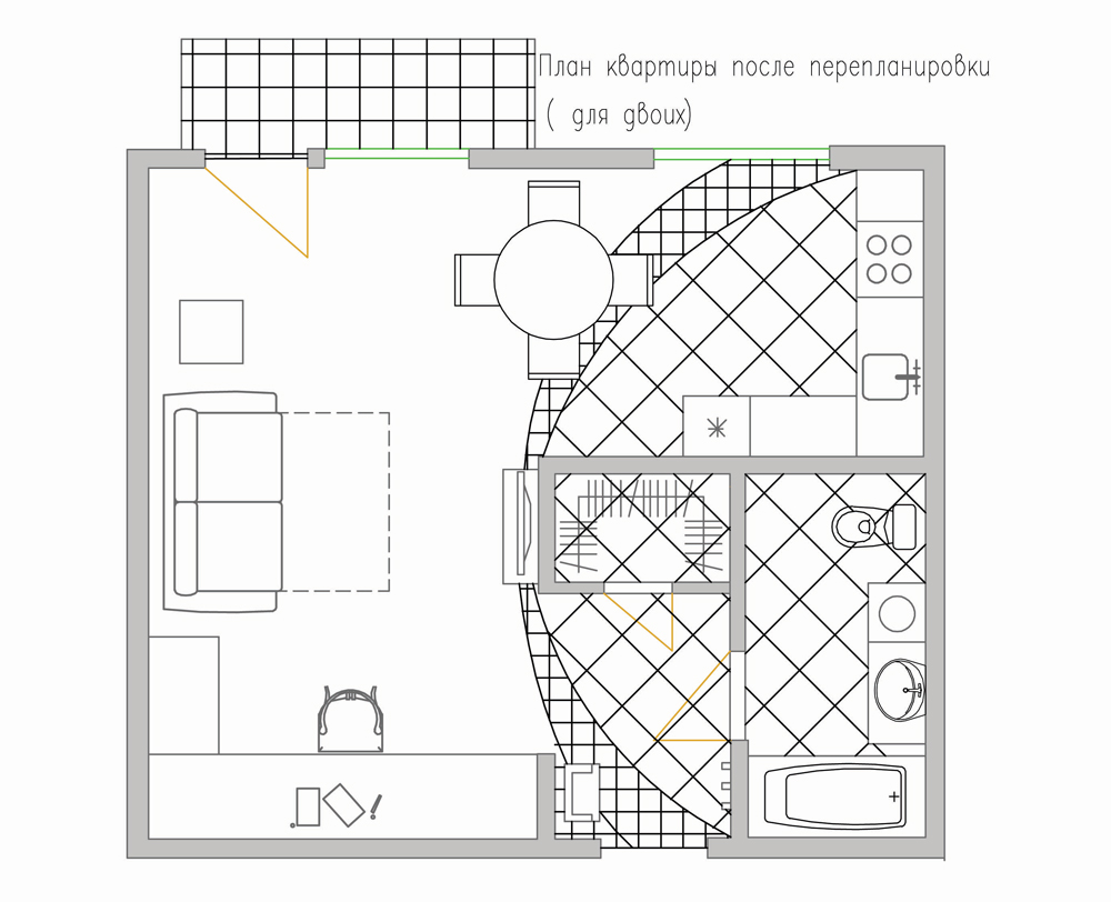 Такой вариант лучше приспособлен к особенностям планировки помещения, способствует выполнению различными зонами своих функций, а также более эстетичен.