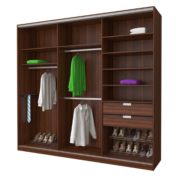 Стандартный же шкаф (длиной 3 метра) позволит разместить в себе практически все вещи, которые хранятся в квартире, включая постельные принадлежности и чемоданы. Такой шкаф избавит вас от необходимости установки шифоньеров, комодов и прочих тумбочек в остальных комнатах.