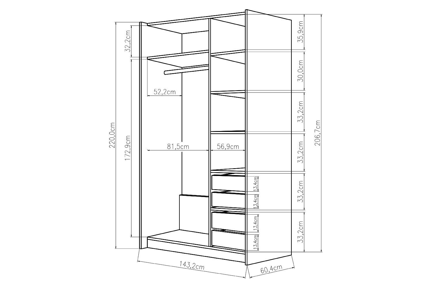Данные размеры зависят от того, как вы разместите штангу для вещей, так как одежде, висящей на вешалках нужно расстояние не менее 60 см в ширину.