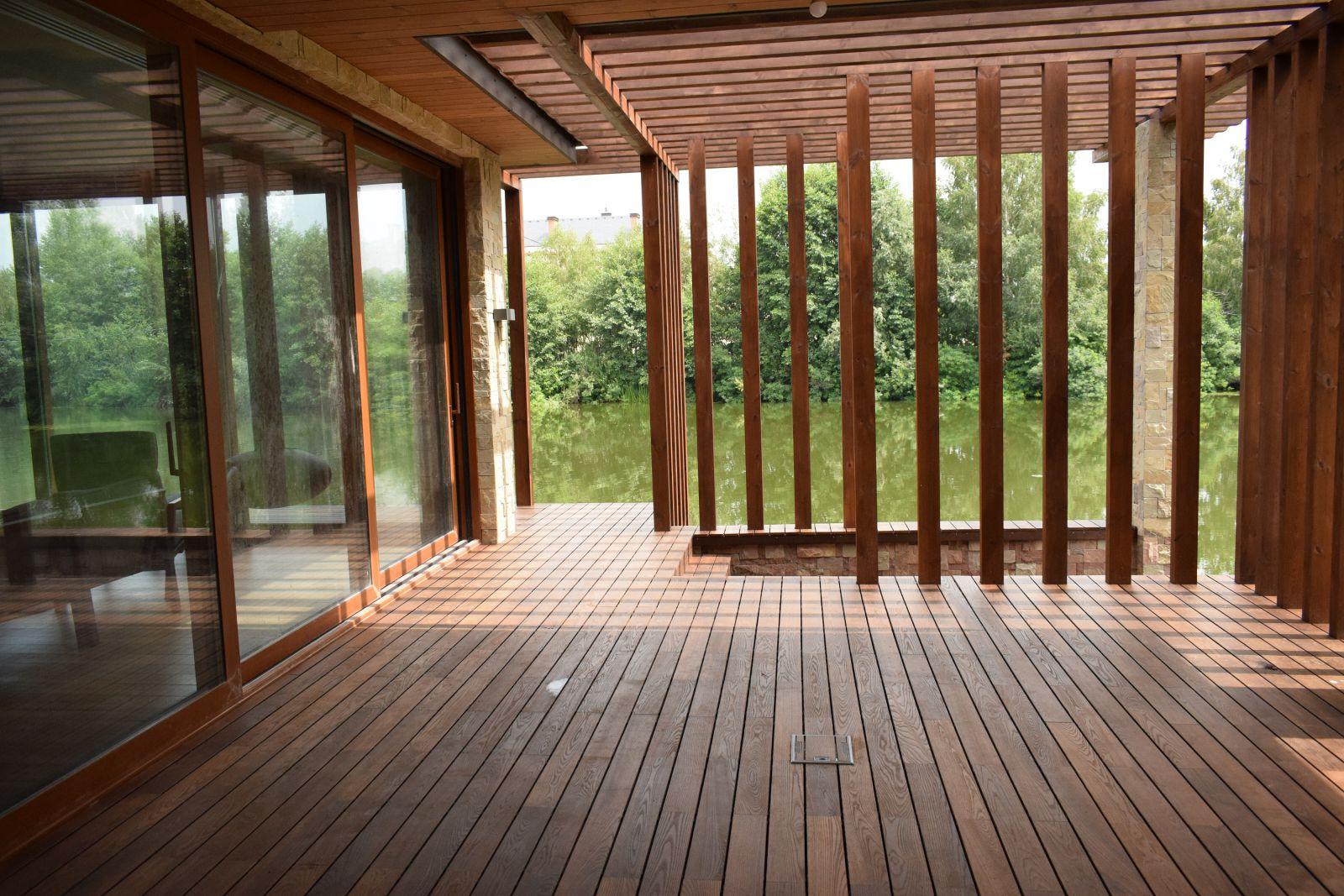 Профнастил из массива дерева подходит для настила на открытой террасе. Это доска шириной 100-150 мм и толщиной 35-40 мм с рифленой противоскользящей поверхностью. Профнастил изготовлен из устойчивой к гниению древесины.Наиболее доступные варианты — лиственница сибирская (от 1 тыс. Руб. За 1 м 2 ) и сосна (от 800 руб. За 1 м), антисептик в растительных условиях 2 ).