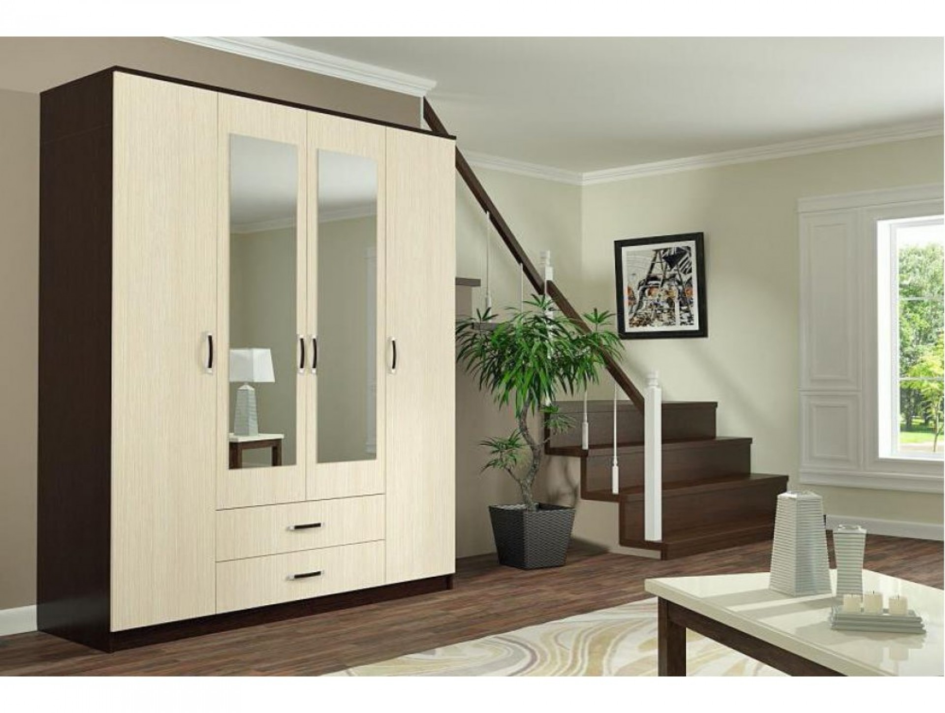 Любопытной комбинацией будет мебель или отдельные предметы со стеклянными элементами: зеркала, фоторамки, зеркальные двери шкафов-купе.