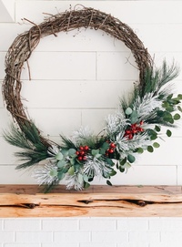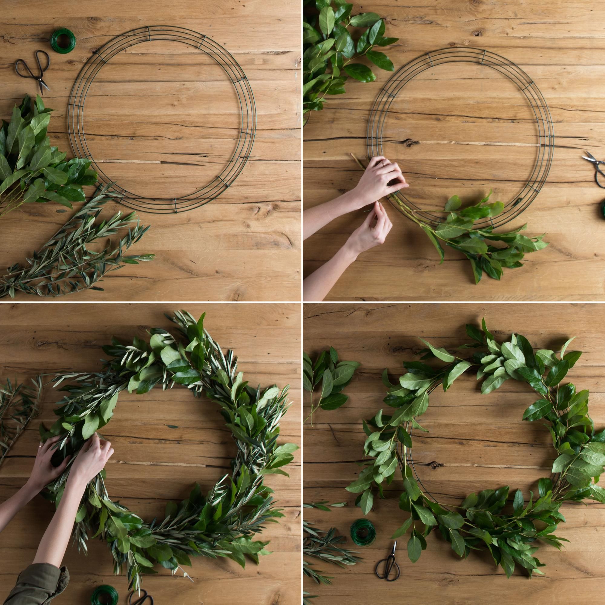 Привяжите край ветки к венку, обмотайте вокруг него и закрепите конец.