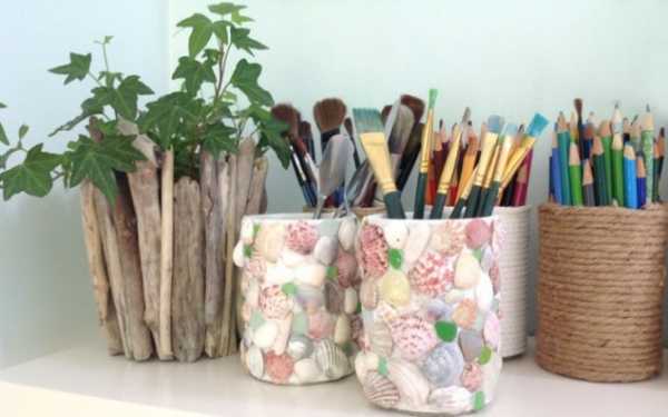 Подставка для карандашей. Или вазочка. Или банка для хранения косметических кистей. В общем, была бы емкость, а для чего ее приспособить — найдется. Делается подобная штука совсем не сложно, для основы надо найти подходящую банку, а дальше — дело техники и вдохновения. Главное, чтобы хватило ракушек.