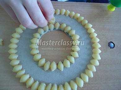 - Используем два вида макарон: «ракушками» выкладываем узоры по внутренней и внешней окружности нашего кольца, а «бантиками» заполняем пространство узором между «ракушками». Можно использовать макароны типа «спиральки» или какие-либо другие, на ваш вкус. Закрепляем каждый элемент клеем.