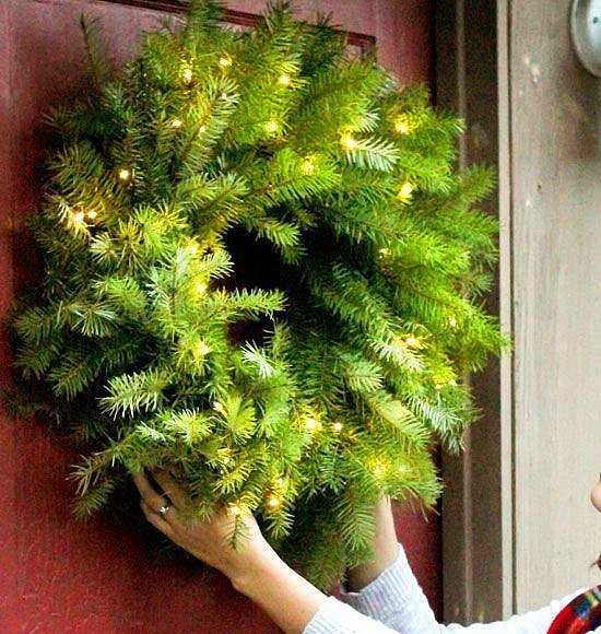 - Ваша дополнительная задача — придумать украшения для этого шикарного венка. Но постарайтесь не увлечься и не загородить украшениями всю прелесть веток ели.