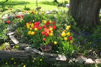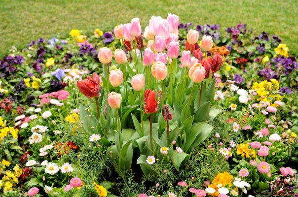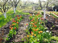 Луковицы тюльпанов высаживают осенью на глубину 10-20 см. Цвести они начинают с конца февраля, заканчивая апрелем или маем, всё зависит от вида и природных условий. Эти яркие, столь привлекательные клумбы радуют глаз длительное время. Многие хозяйки высаживают несколько видов, тогда клумба смотрится ещё эффектней.