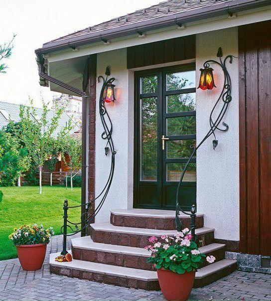 - Довольно большой популярностью пользуется вариант с комбинированием различных материалов. Например, с различными типами сырья могут сочетаться кованые детали, которые придают входу в дом самобытности и особого шарма. Металл может использоваться для конструирования перил в каменных сооружениях, зачастую с помощью него создаются очень изящные витые элементы.
