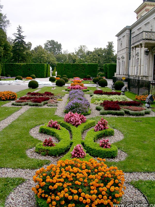 Строгие геометрические формы цветочных посадок на открытых площадках, являются дополнением архитектурного ансамбля зданий. Выполнены в виде цветочного рисунка партера клумбы нести именуются арабесками.