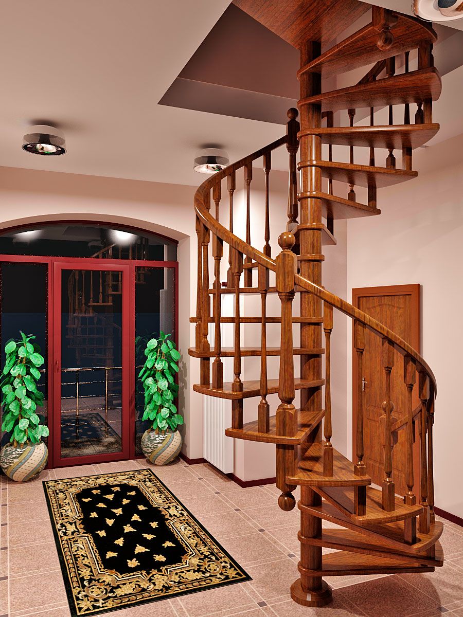 Еще одним интересным видом лестницы является спиральный вариант конструкции. Здесь нет центрального столба и, соответственно, они требуют большего пространства. Ступени относятся к поворотному типу (забежные), т. е. их внутренний край уже, чем наружная часть, а нормальная расчетная ширина соблюдена только в средней части.