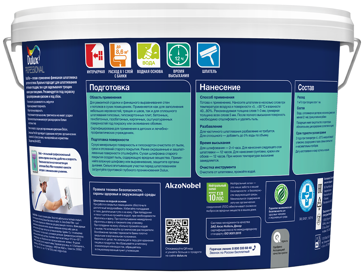 Может наноситься толстыми слоями, максимально быстро устраняя даже глубокие неровности.