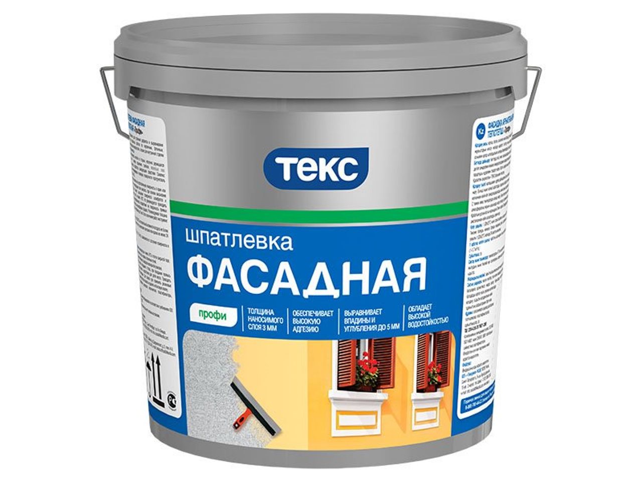 Фасадная акриловая шпаклевка – характеризуется повышенной влагостойкостью и применяется для наружных работ по бетону, штукатурке и дереву. Отлично заполняется и выравнивается, не трескается, за шпателем не тянется, имеет повышенную прочность. Материал быстро сохнет, легко шлифуется, обладает устойчивостью к истиранию и высокой пластичностью.