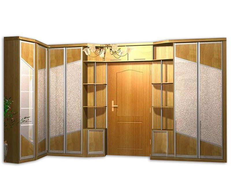 Угловые шкафы-купе хорошо использовать в небольших по площади прихожих по форме, близкой к квадрату или прямоугольнику. Такой шкаф более узкий, но вместительный за счет своей глубины. Боковые полочки способны украсить такую конструкцию.