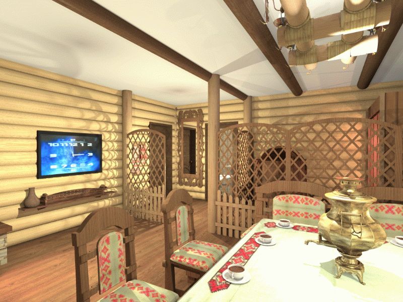 И естественно, для того чтобы создать дополнительное ощущение комфорта и домашнего уюта, не лишним будет наполнить комнату отдыха в бане мелкими атрибутами банной тематики. Березовые и дубовые веники, развешанные по стенам, шкафчики для посуды и полочки из натурального дерева, посуда, расписанная в национальном стиле, шкуры животных или просто мягких ковер, расстеленный на полу, банки под чаи и травы, все те мелочи с русским колоритом, которые будут подчеркивать самобытность и единение с природой.