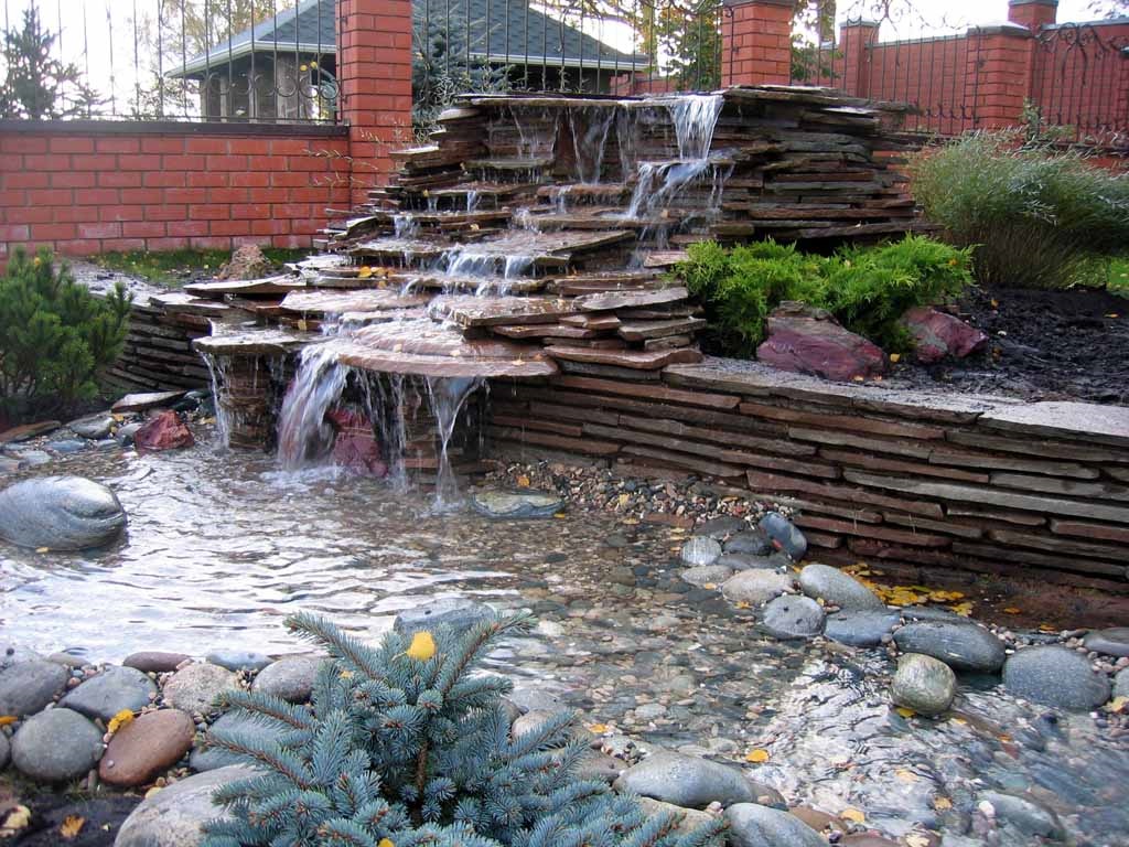 Второй вариант более трудоемкий, так как водопада каскадом или альпийской горкой придется выкладывать вручную поэтапно.