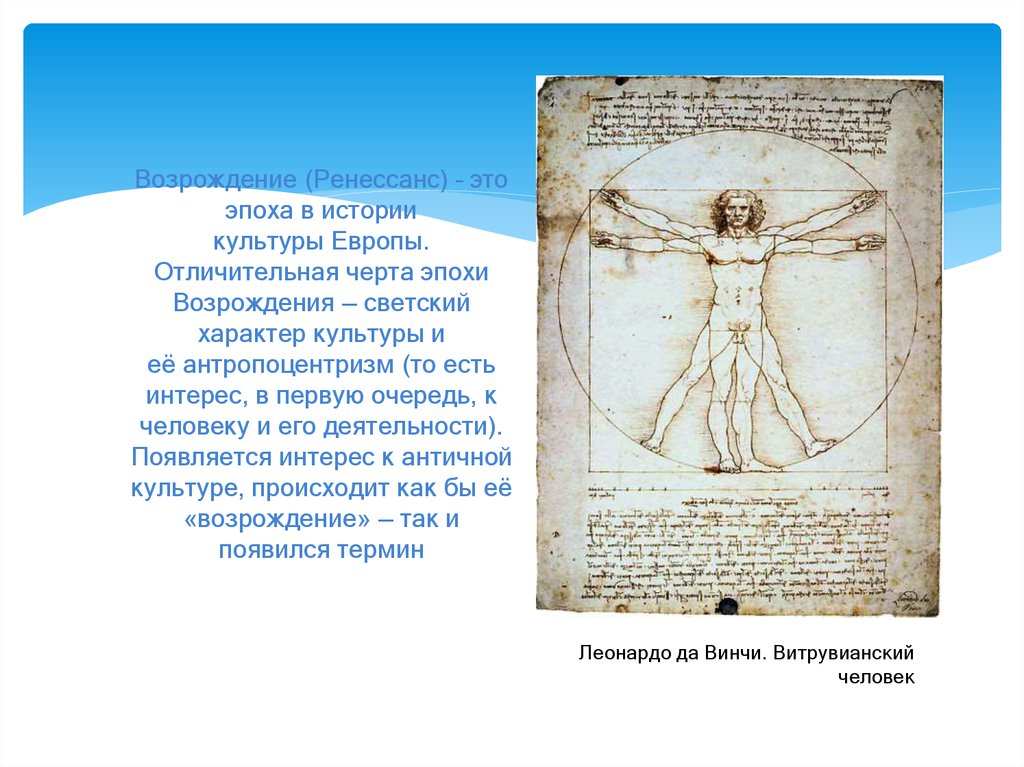 Возрождение. XV-XVI века. В это время Европа проснулась от средневековой спячки, ей вновь стала интересна культура забытой античности – Древней Греции, Древнего Рима. Европейцев вновь стала интересовать наука, изучение человеческого тела. Их вновь стали интересовать перспектива и симметрия, гармония.