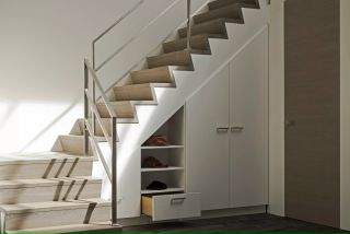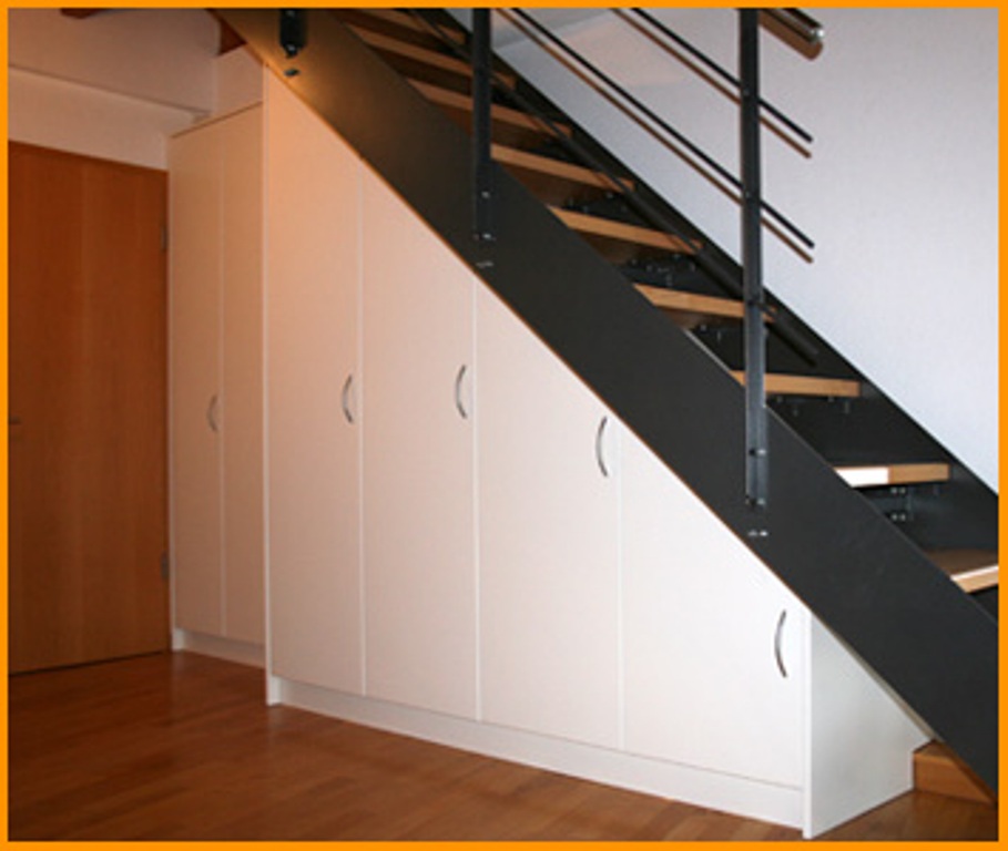 Предметы мебели, предназначенные под лестницу, можно использовать готовые, сделать самому или под заказ.