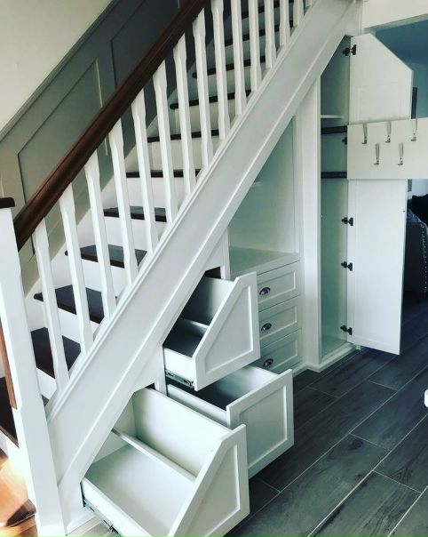 Сделайте под лестницей ящикиИспользуйте пространство под лестницей, объединив ящики и стеллажи для хранения вещей. Это отличный способ без особых усилий увеличить объем хранилища. Идеально спроектированные встроенные ящики и комоды — привлекательные и модные варианты, позволяющие максимально использовать это пространство.