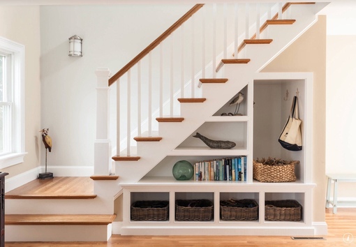 Если, например, лестница ведет из полуподвального помещения, либо вы планируете использовать подлестничное место в доме для хранения книг, фотографий в рамках и памятных сувениров.