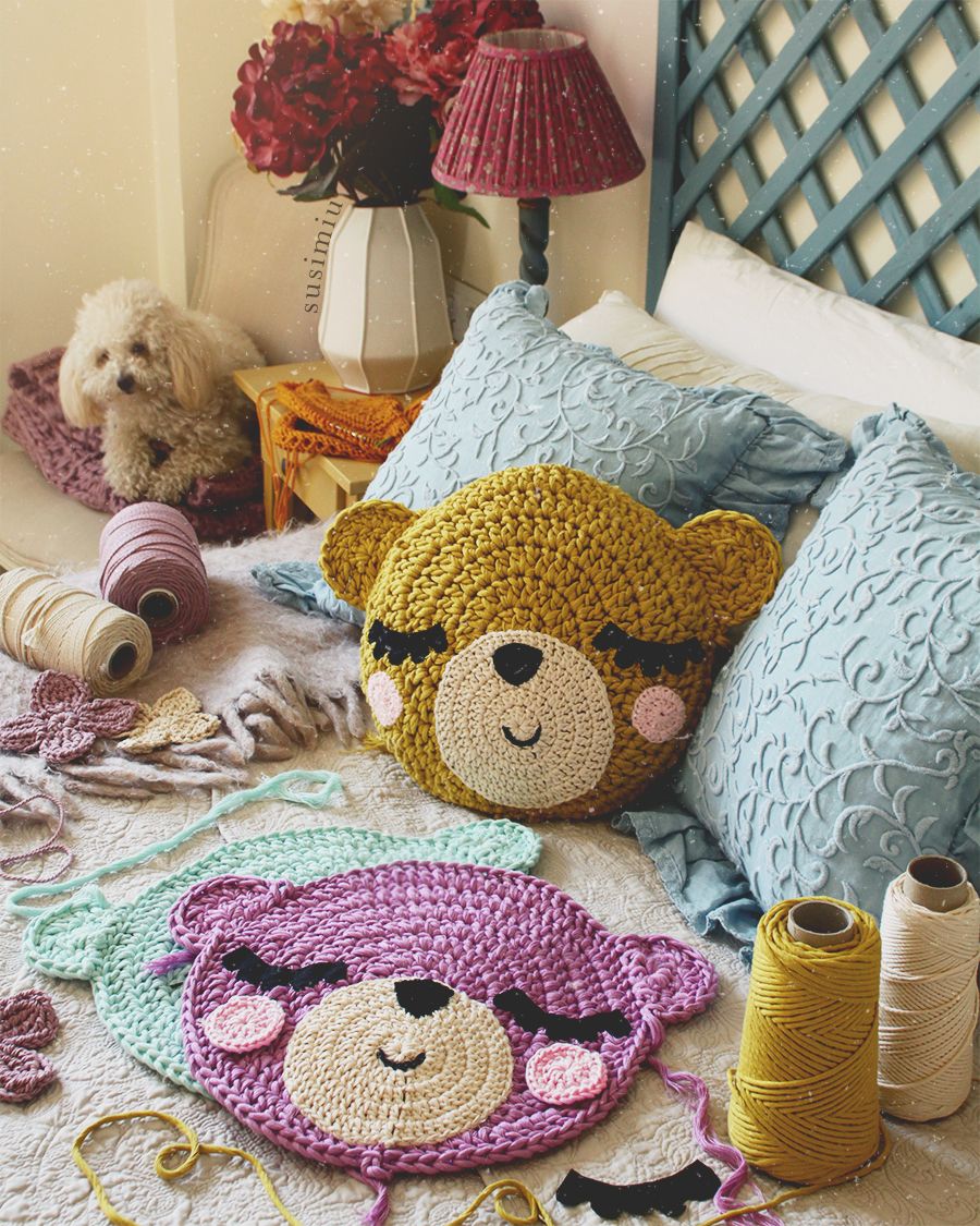 Можно связать множество изделий, от подушек до штор, от ковров и пледов до милых грелок на чайники и кружки.