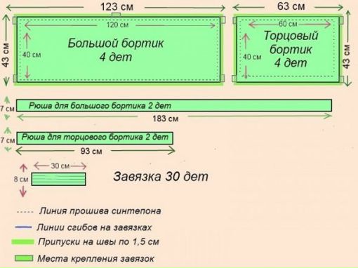 Бортики являются полезной вещью, которая может обезопасить деток от ударов о прутики постели. Для их изготовления нужна более плотная ткань, которую нужно купить отдельно. Изготовить ее можно следующим образом: