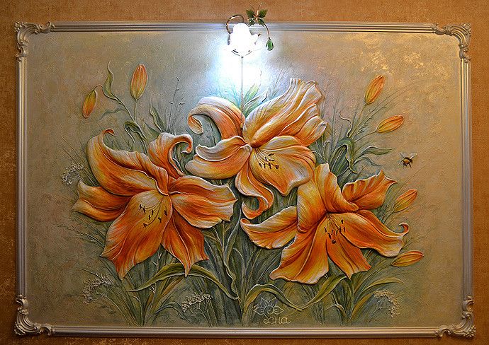 Картина уникальная, точное повторение невозможно ввиду особенностей стилистики. Фон картины сделан текстурным, похожим на венецианскую мозаику, а цветы объемные и будто живые – они выступают из картины.