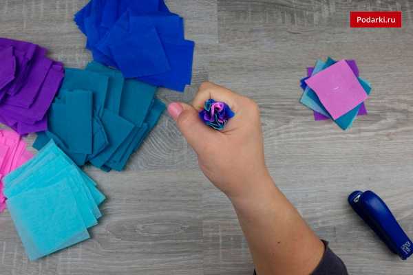 Нарежьте гофрированную бумагу на квадраты размером 8х8 см.
