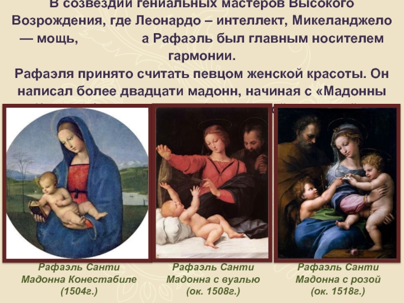 ) он еще связан в передаче движения и пространства и стремится главным образом к достижению пластического эффекта, то в таких картинах, как «Мадонна со щегленком» (около 1506 г.), «Прекрасная садовница» (1507 г.) или «Мадонна среди зелени» (1506 г.), он добивается единства пространства и фигур, свободы движения и расположения групп. В этих картинах он создает новый образ мадонны — земной и реальный, но вместе с тем опоэтизированный, лишенный черт повседневной обыденности.