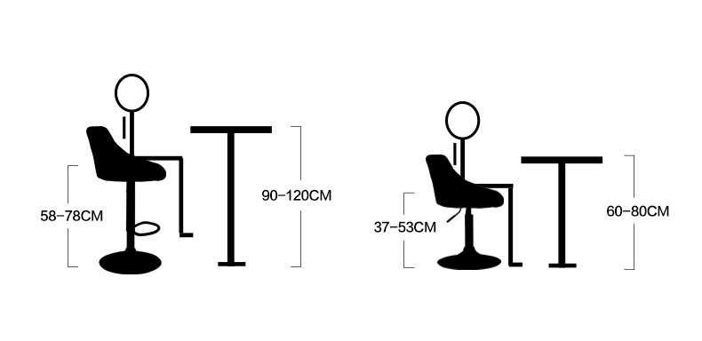 Кухонные табуреты бывают обычно 42-48 см. Если кухонный табурет выше – должна быть опора для ног (от опоры до сиденья должно быть расстояние 32-42 см).