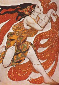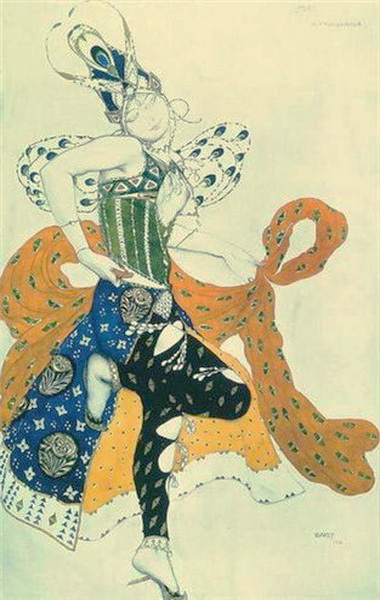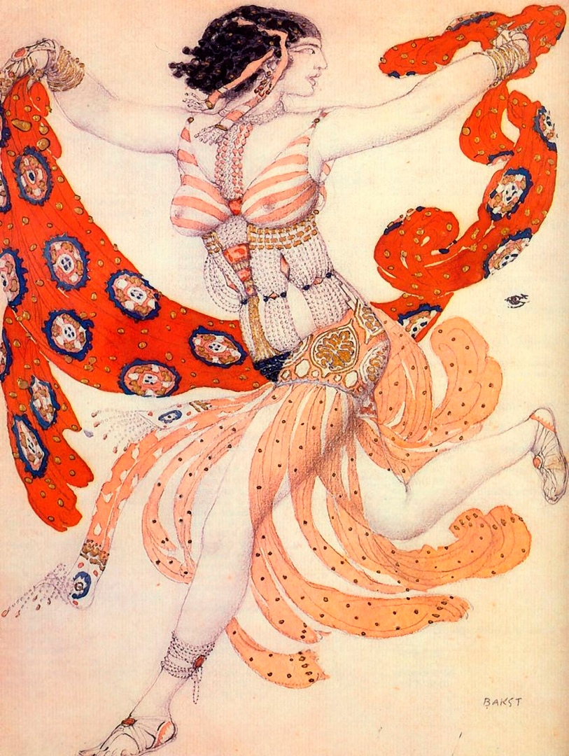 — Талант Леона Бакста, наиболее органично проявившийся в сценографии, был востребован в постановках Анны Павловой и Иды Рубинштейн.Его балетмейстерские декорации к пьесам Антона Аренского «Клеопатра» (1909 г.), «Жар-птица» Игоря Стравинского (1910 г.) выражали феерическую образную сущность, к тому же художнику удалось придать костюмам великолепную восточную роскошь, но и непринужденная легкость одежды древности. Это было очень важно для модернизации балета, постепенного отхода от условности канонических поз и движений в сторону «ритма свободного тела».