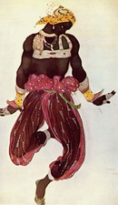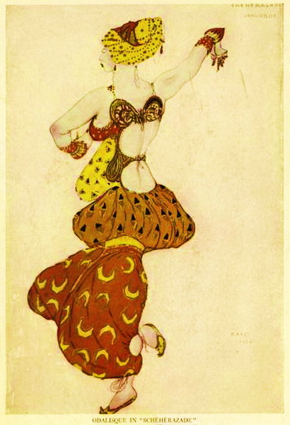 Шахерезада, , представленная в 1910 году в Национальном театре оперы в Париже с участием танцоров Вацлава Нижинского и Иды Рубинштейн, вызвала особую сенсацию, создав ощущение богатой, лихорадочной клаустрофобии и таинственности — живое полотно чувственности и декаданс. Бакст получил международную известность благодаря своим знаменитым проектам и стал художественным руководителем Русских балетов в период их расцвета (1909 — 14).