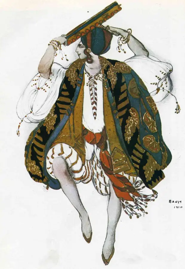 В рамках первой программы Ballets Russes в Париже Бакст разработал декор и костюмы в восточном стиле для тематического балета Мишеля Фокина « Клеопатра » (1909).Его драматический, новаторский дизайн подчеркивает цвет, насилие и чувственность, наполняя энергией экзотические и фантастические сюжеты и персонажей балета.