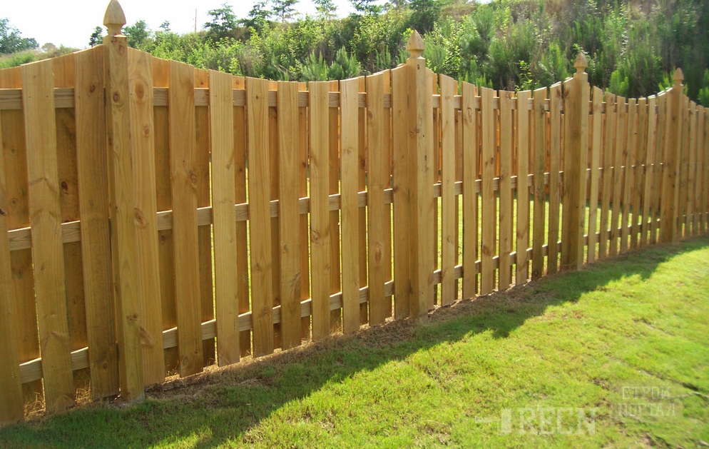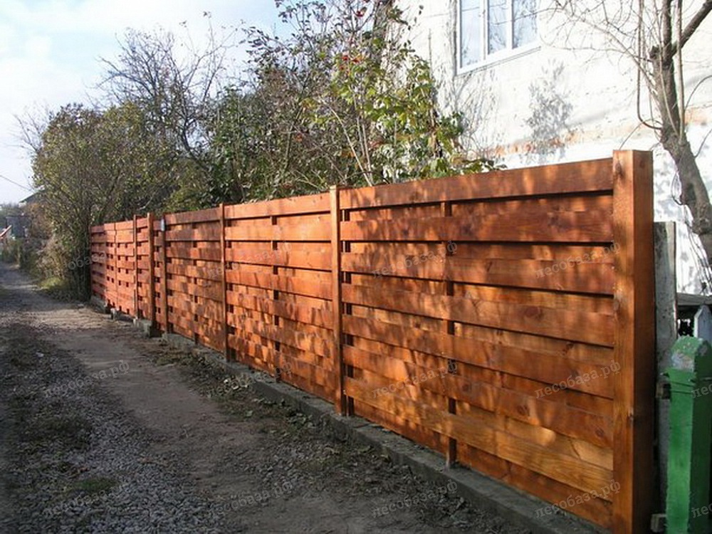 Это заграждение, когда на тяжелые деревянные столбы крепятся горизонтально с небольшим просветами 2-4 широкие доски. Если взять хорошо обработанные тонкие доски и чуть большее их количество, то можно соорудить красивое ограждение для деревянного дома.