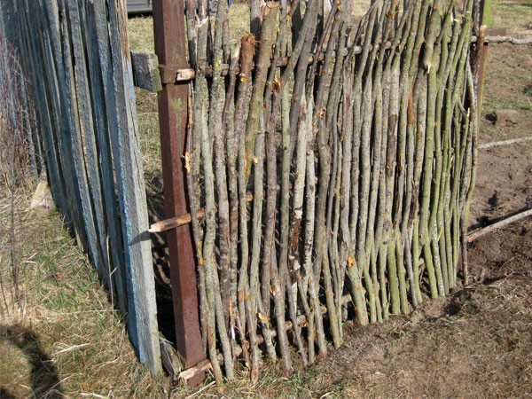 Чтобы сделать ограждение своими руками, вполне подходят ветки любой толщины. Забор из веток является самым дешевым среди всех подобных изделий.