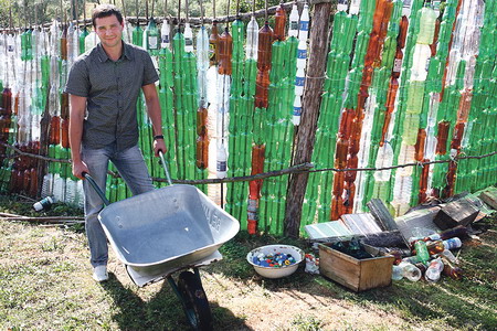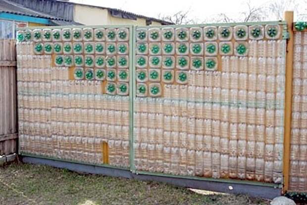 За год можно насобирать пластиковых бутылок на приличную изгородь. Для крепления ПЭТ-ёмкостей понадобятся песок и раствор.