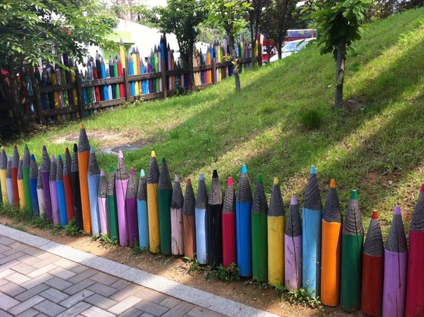 Заточите брёвна, раскрасьте их под карандаши — и вот весёлый заборчик!