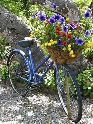 Далее приступаем к декорированию. Для того, чтобы творение смотрелось более оригинально, лучше всего украсьте его вьющимися однолетними растениями, невысокими почвопокровными цветами. В таких велосипедных клумбах хорошо живут: