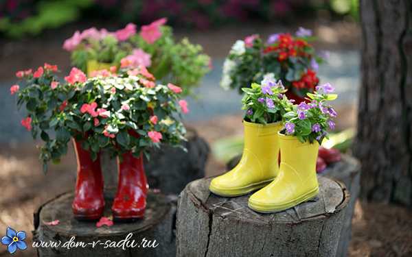 Не забывайте о том, что даже ненужная старая обувь может стать оригинальным украшением участка. Возьмите пару ярких детских резиновых сапог, сделайте отверстия в подошве, насыпьте туда дренаж, затем грунт и посадите цветы. Получатся отличные садовые кашпо для уличных цветов. И особенно приятно, что мы украшаем двор своими руками без лишних затрат.