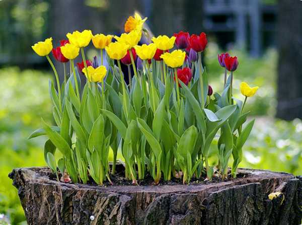 В старых пнях можно так же устроить красивые садовые клумбы своими руками. Они очень просты, и изящны. Такое украшение двора своими руками может быть сезонным, если посадить в пни тюльпаны