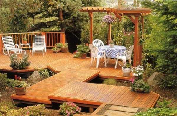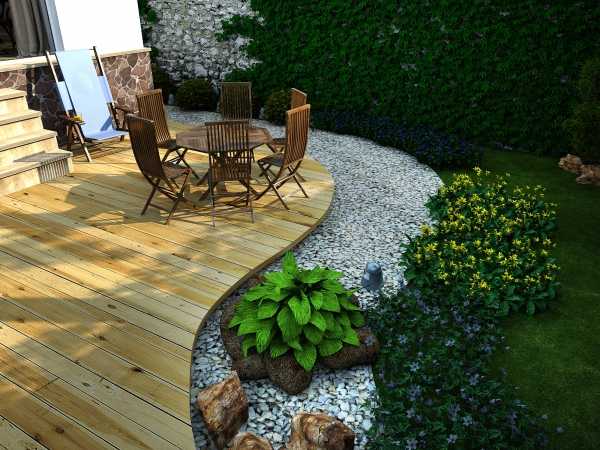 Чтобы его оригинально организовать, следует установить деревянный помост или палубы. По периметру их можно облагородить многолетними растениями. И, конечно же, приобретите садовую мебель! При этом лучший выбор для нее – это складные варианты, которые на зиму можно будет убрать и спрятать на чердаке.