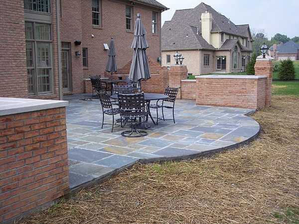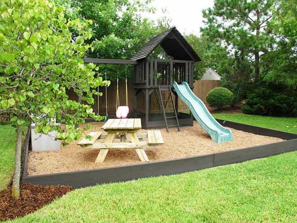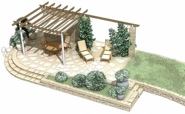 На заднем дворе площадку также можете выложить при помощи каменных плит и бетона, также возможен вариант засыпания гравием, галькой…